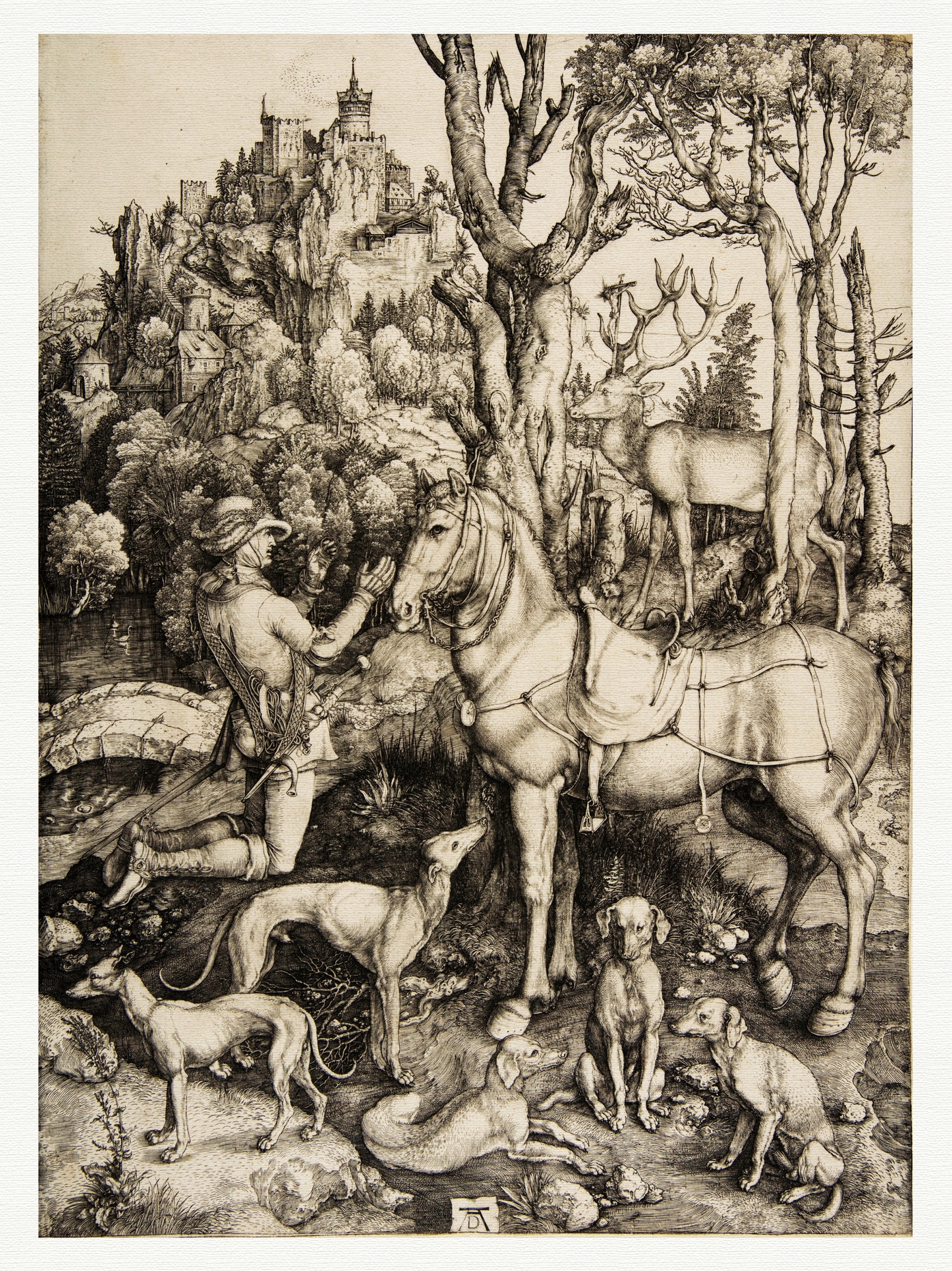 Pewnego dnia będąc na łowach Placyd-Eustachy ujrzał ślicznego jelenia i zaczął go ścigać. Pogoń trwała bardzo długo lecz zakończyła się niespodziewanie. W pewnym momencie jeleń zupełnie pozbawiony lęku stanął i zamiast kontynuować ucieczkę zwrócił się ku myśliwemu. Placyd-Eustachy korzystając z sytuacji, napiął łuk by w stronę jelenia wypuścić strzałę, ale w jednej chwili powstrzymał się, gdyż między tykami wieńca byka ujrzał dziwne światło.