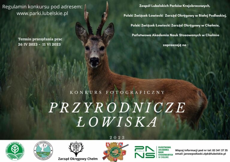 Zespół Lubelskich Parków Krajobrazowych Oddział w Janowie Podlaskim wraz z Zarządem Okręgowym Polskiego Związku Łowieckiego w Białej Podlaskiej oraz Zarządem Okręgowym Polskiego Związku Łowieckiego w Chełmie i Państwową Akademią Nauk Stosowanych w Chełmie zapraszają na konkurs fotograficzny o tematyce przyrodniczo-łowieckiej.