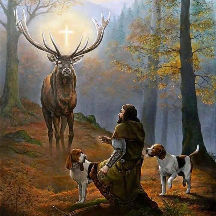 Wizja Huberta Jego żona zmarła, rodząc syna, a Hubert wówczas wycofał się z życia dworu, wprost do zalesionych Ardenów, i tam też oddał się całkowicie polowaniom. Jednak jego wielka transformacja duchowa była bliska.