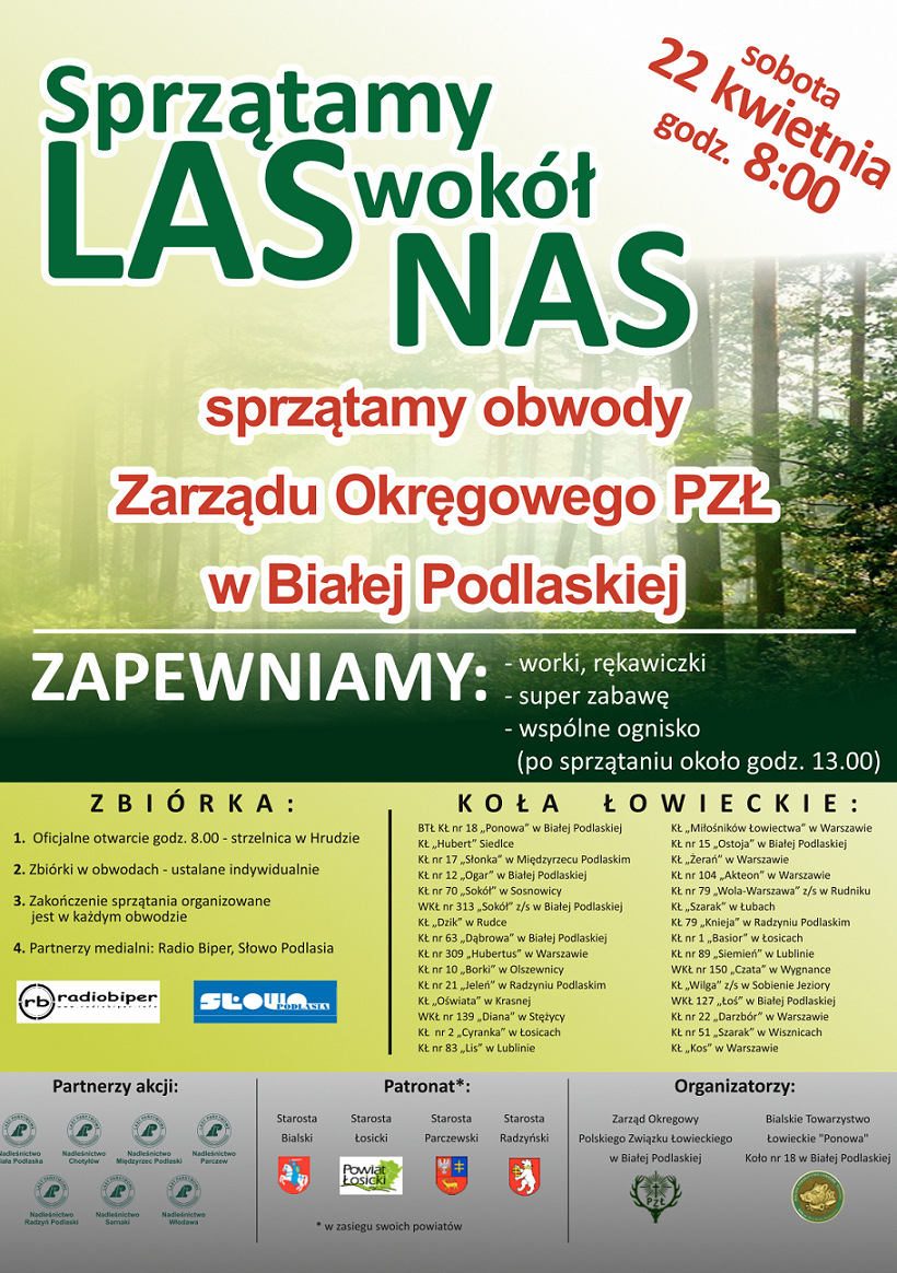 W dniu 22 kwietnia będziemy obchodzili Dzień Ziemi. To idealna okazja, by zrobić coś dobrego dla planety. My myśliwi, pomagamy jej przez cały rok, bo nasze podejście to przede wszystkim aktywna dbałość o środowisko naturalne i racjonalne korzystanie z jego zasobów. Dlatego też łowiecki rok gospodarczy rozpoczynamy akcją „Sprzątamy las wokół nas”. To już trzecia edycja akcji zapoczątkowanej przez myśliwych z Bialskiego Towarzystwa Łowieckiego KŁ nr 18 Ponowa. W bieżącym roku, po raz drugi, akcja obejmie cały Okręg Bialskopodlaski Polskiego Związku Łowieckiego. Udział w akcji zadeklarowało 30 kół łowieckich z terenu czterech powiatów i siedmiu nadleśnictw.