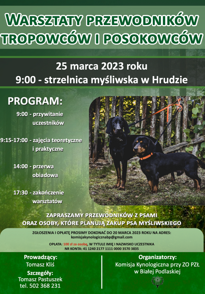 ZO PZŁ w Białej Podlaskiej zaprasza przewodników z psami praz osoby planujące zakup psa myśliwskiego na „Warsztaty przewodników tropowców i posokowców” organizowane przez Komisję Kynologiczną przy ZO PZŁ w Białej Podlaskiej.